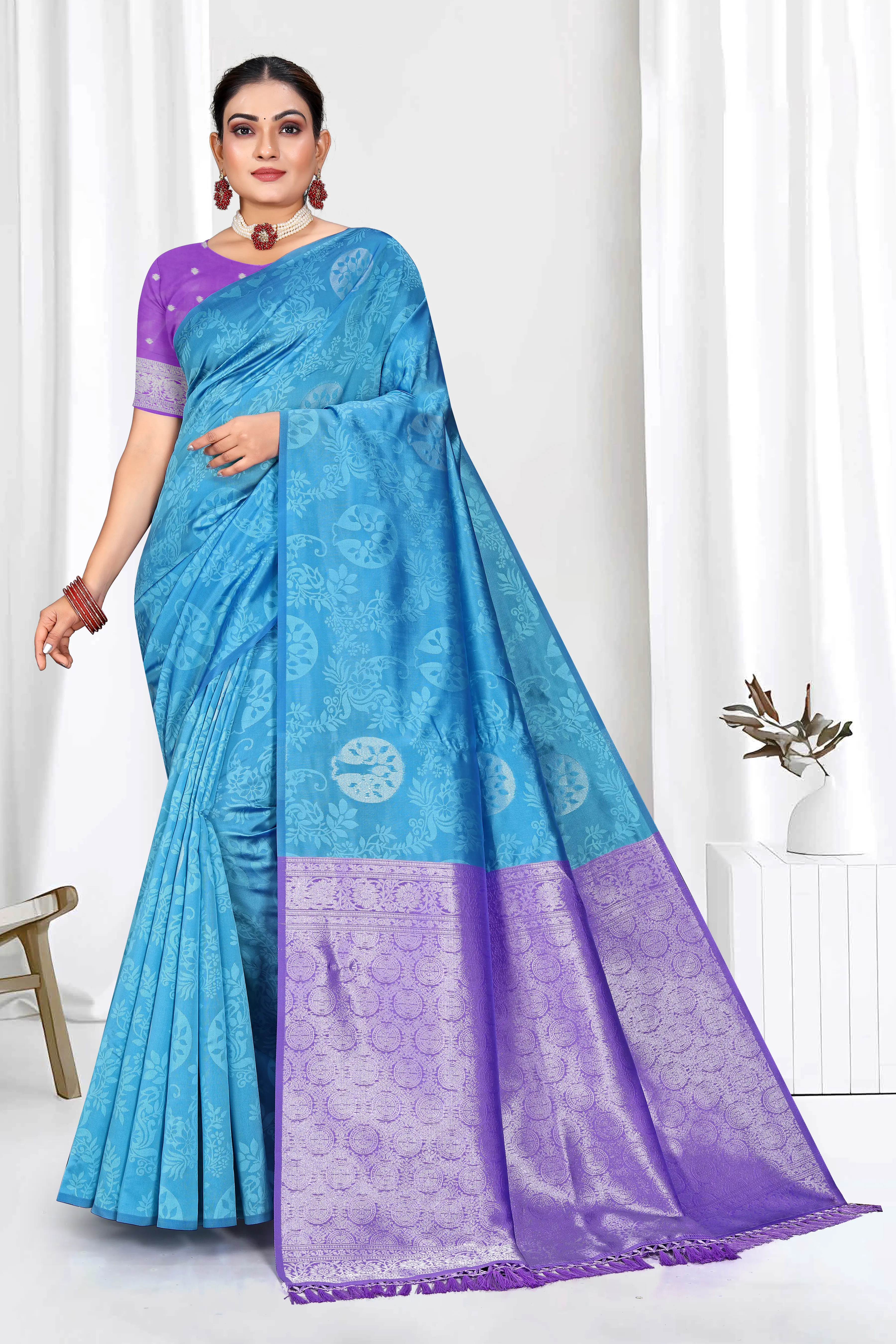 Step into timeless grace with our exquisite Silk Saree, a perfect blend of tradition and modern sophistication. Crafted with intricate weaving, this saree showcases a stunning contrast of aqua blue and golden hues, adorned with delicate floral motifs that add a touch of royal charm.
