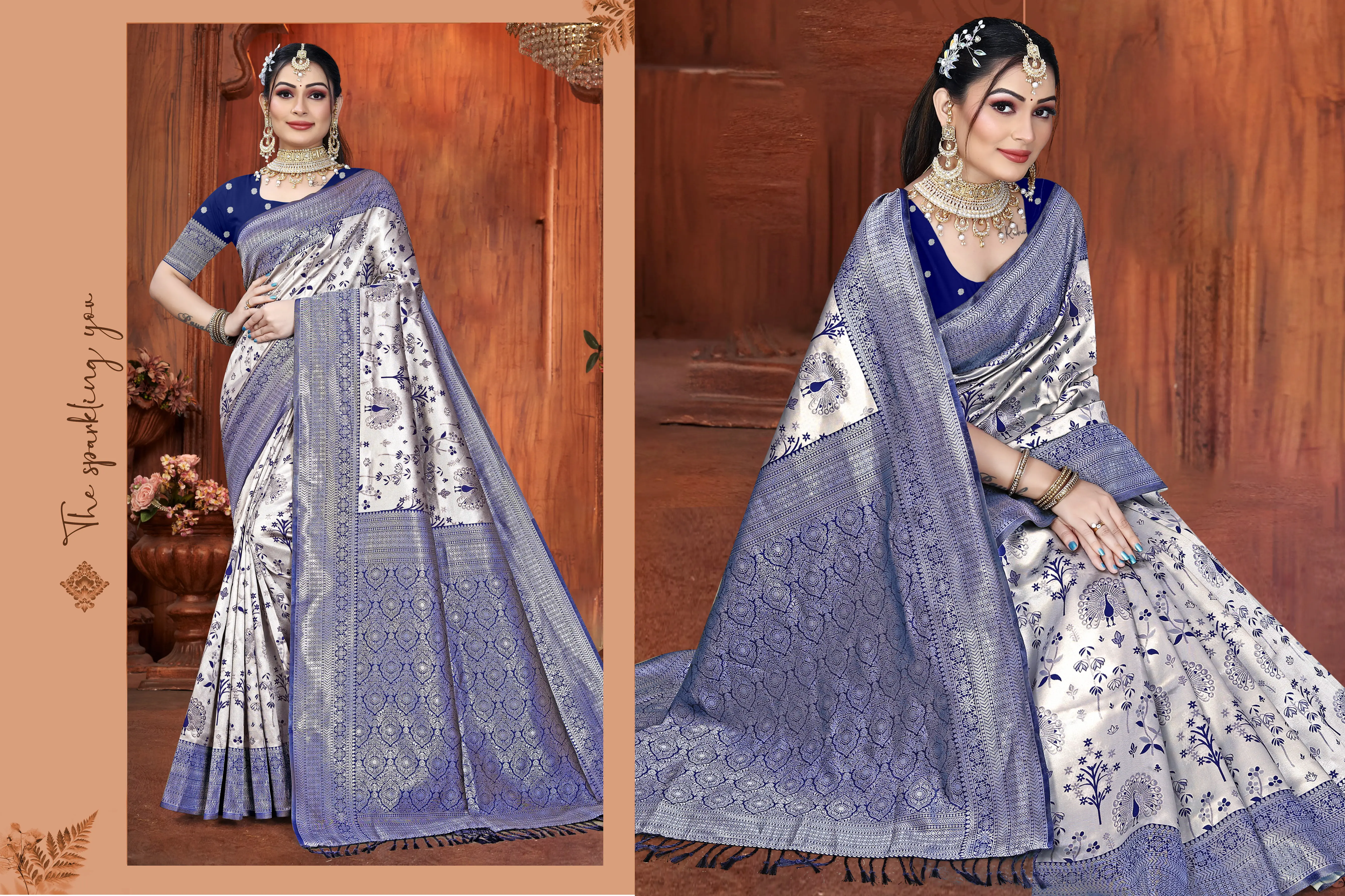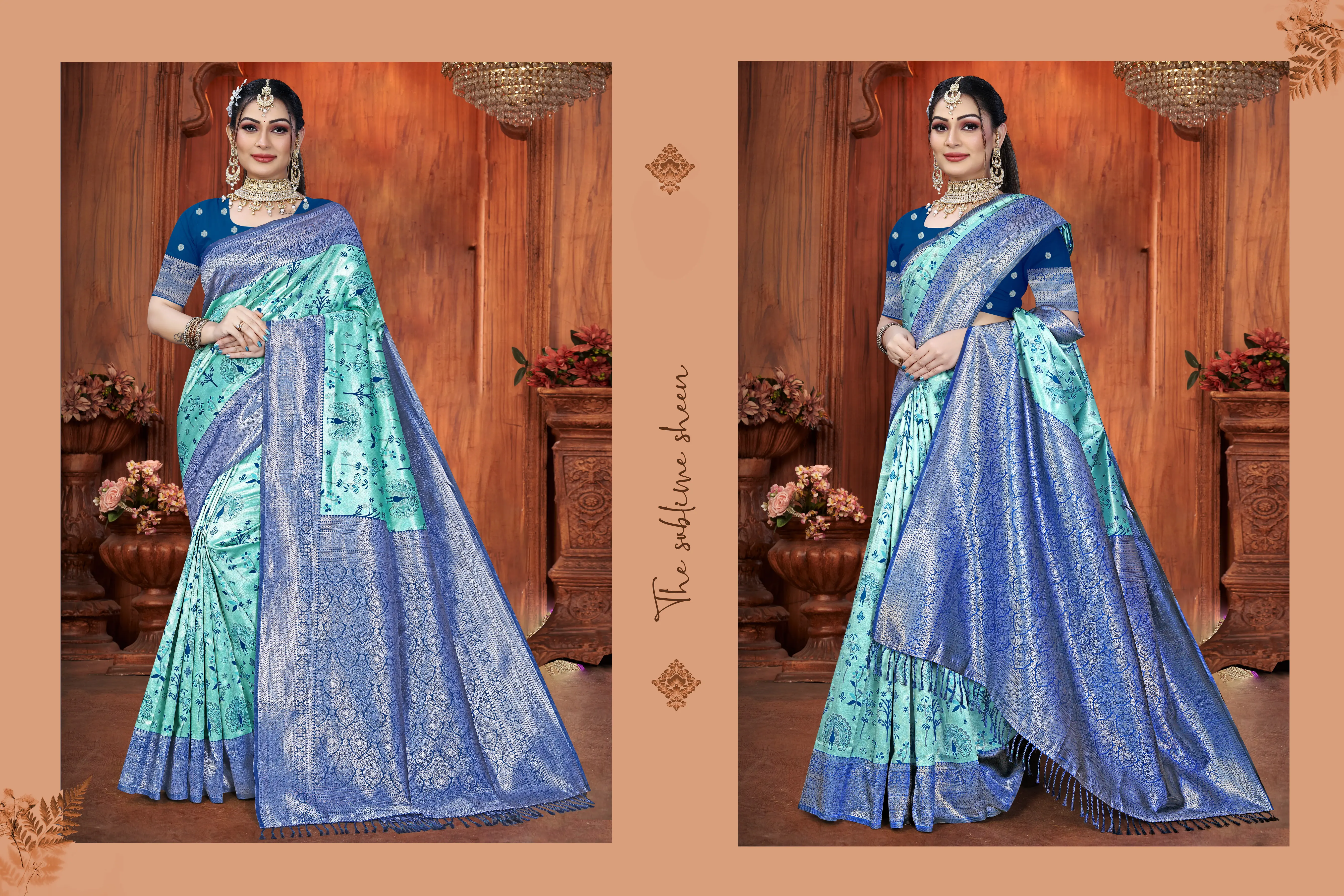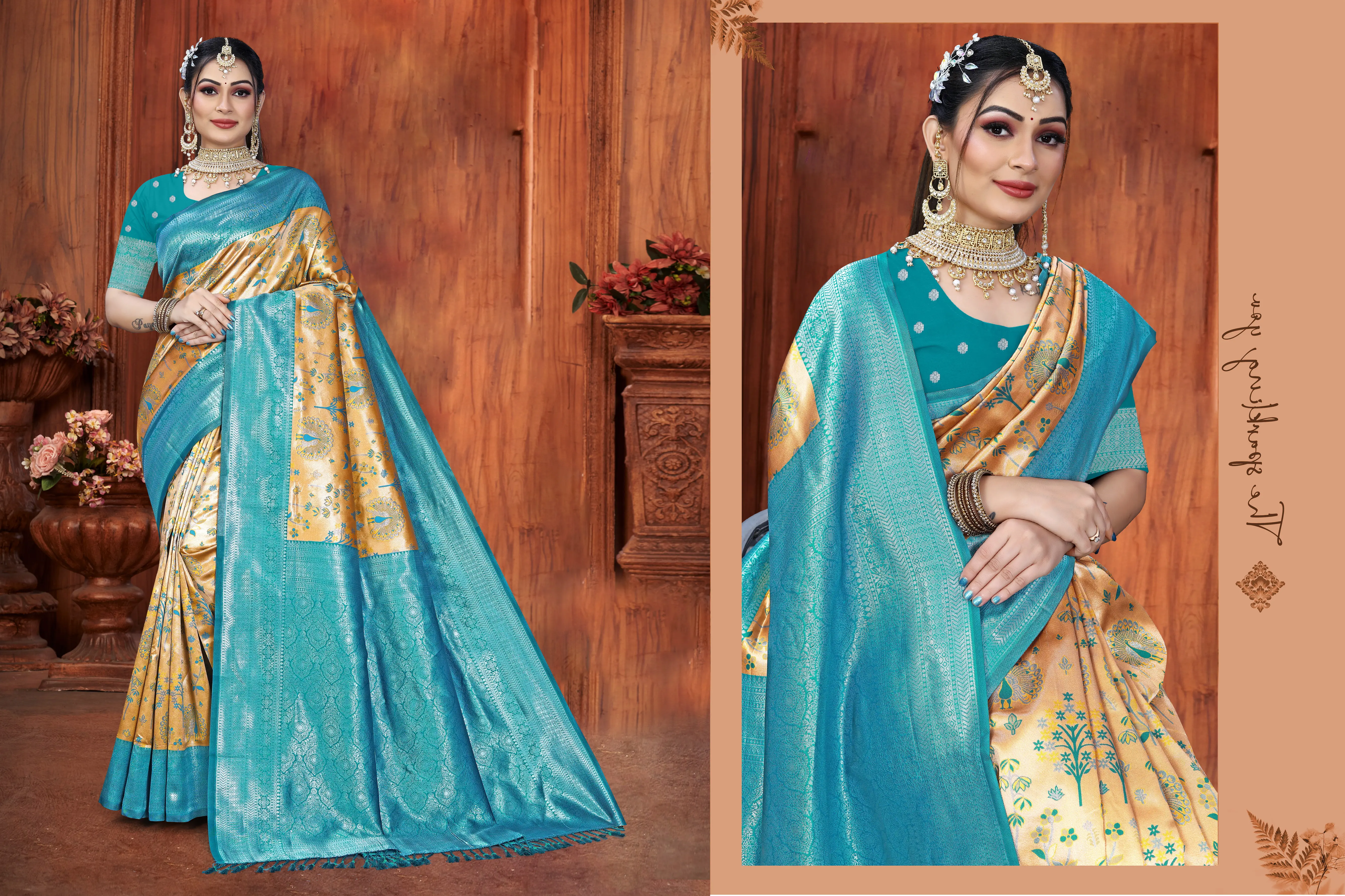 Step into timeless grace with our exquisite Silk Saree, a perfect blend of tradition and modern sophistication. Crafted with intricate weaving, this saree showcases a stunning contrast of aqua blue and golden hues, adorned with delicate floral motifs that add a touch of royal charm.