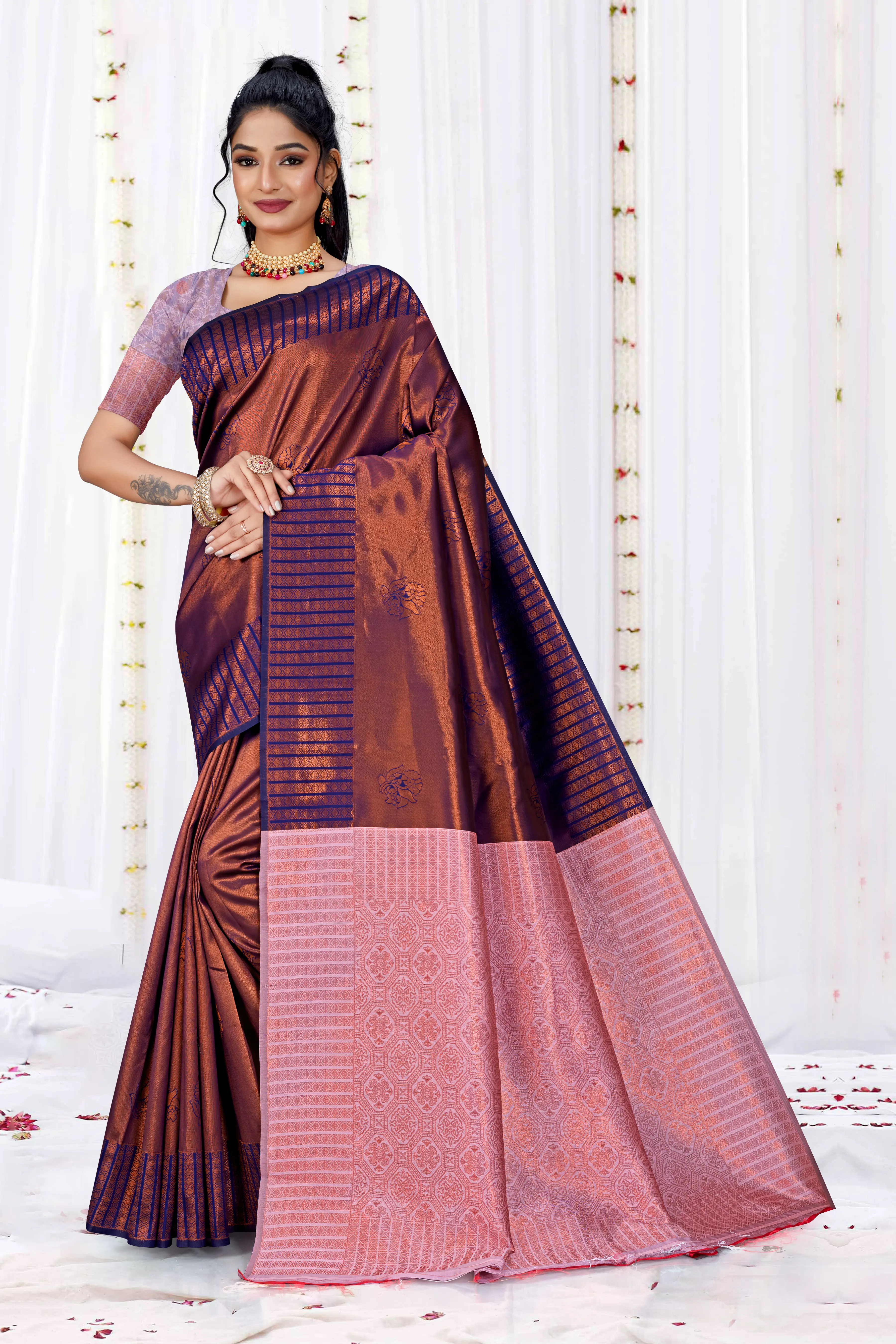 Step into timeless grace with our exquisite  Silk Saree, a perfect blend of tradition and modern sophistication. Crafted with intricate weaving, this saree showcases a stunning contrast of aqua blue and golden hues, adorned with delicate floral motifs that add a touch of royal charm.