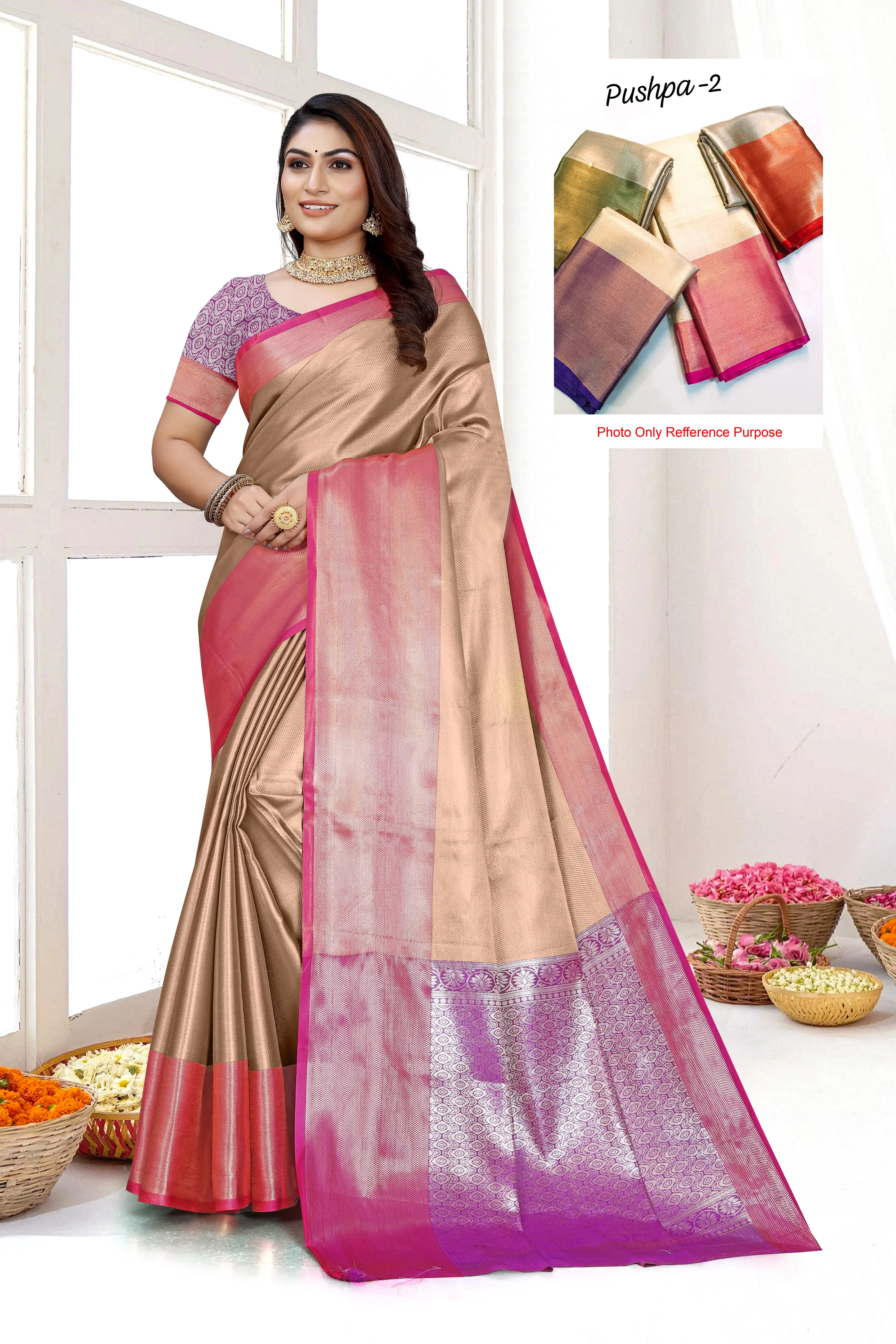 Radiate timeless grace with the Pushpa Saree, crafted from luxurious silk in a soothing beige tone. Adorned with vibrant floral prints inspired by nature’s beauty, this saree perfectly blends softness, color, and elegance.