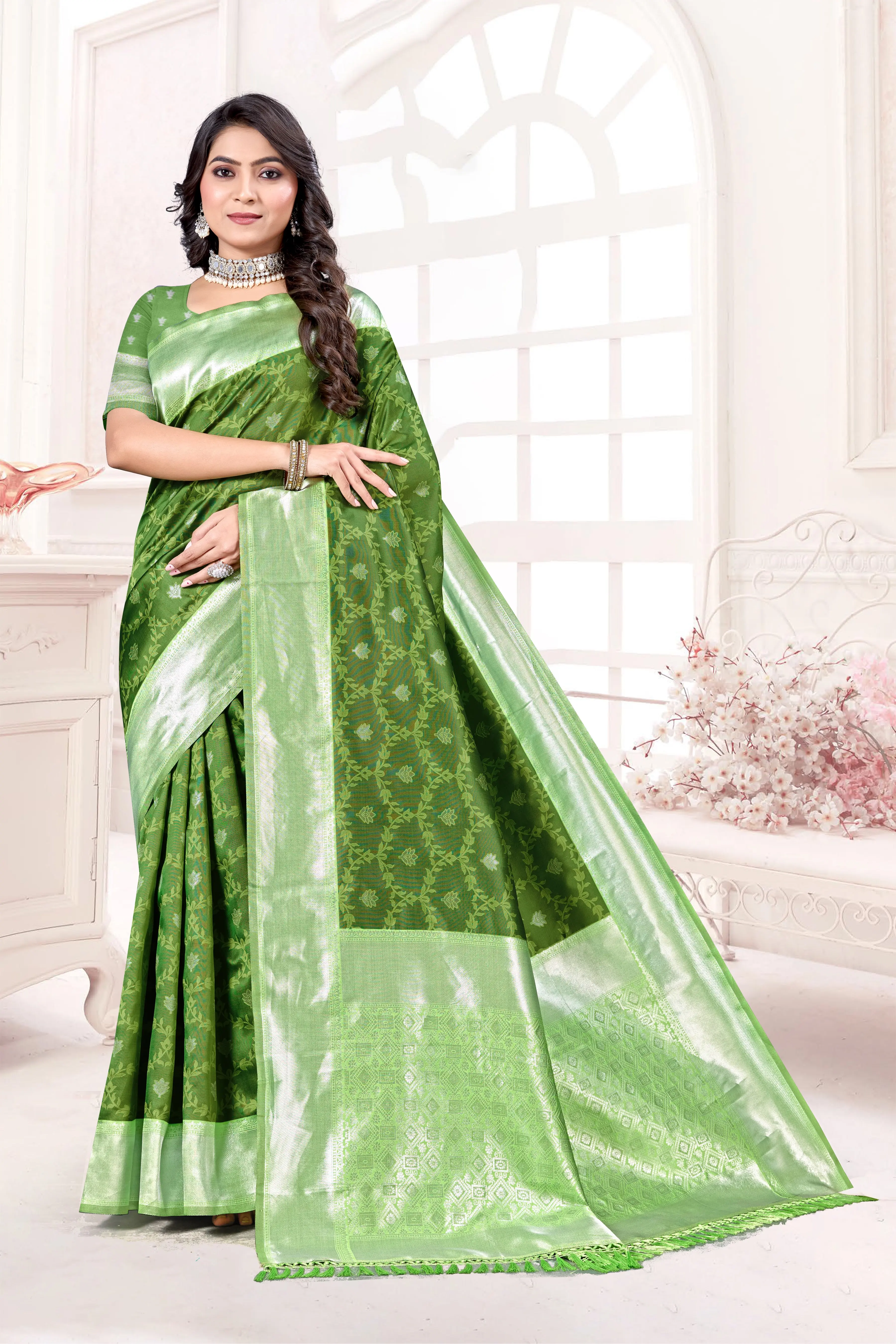 Its smooth texture and elegant fall make it perfect for festive occasions, evening gatherings, and celebrations. Finished with a tassel-detailed pallu, the Silver Magic Saree beautifully captures the essence of timeless elegance and modern grace