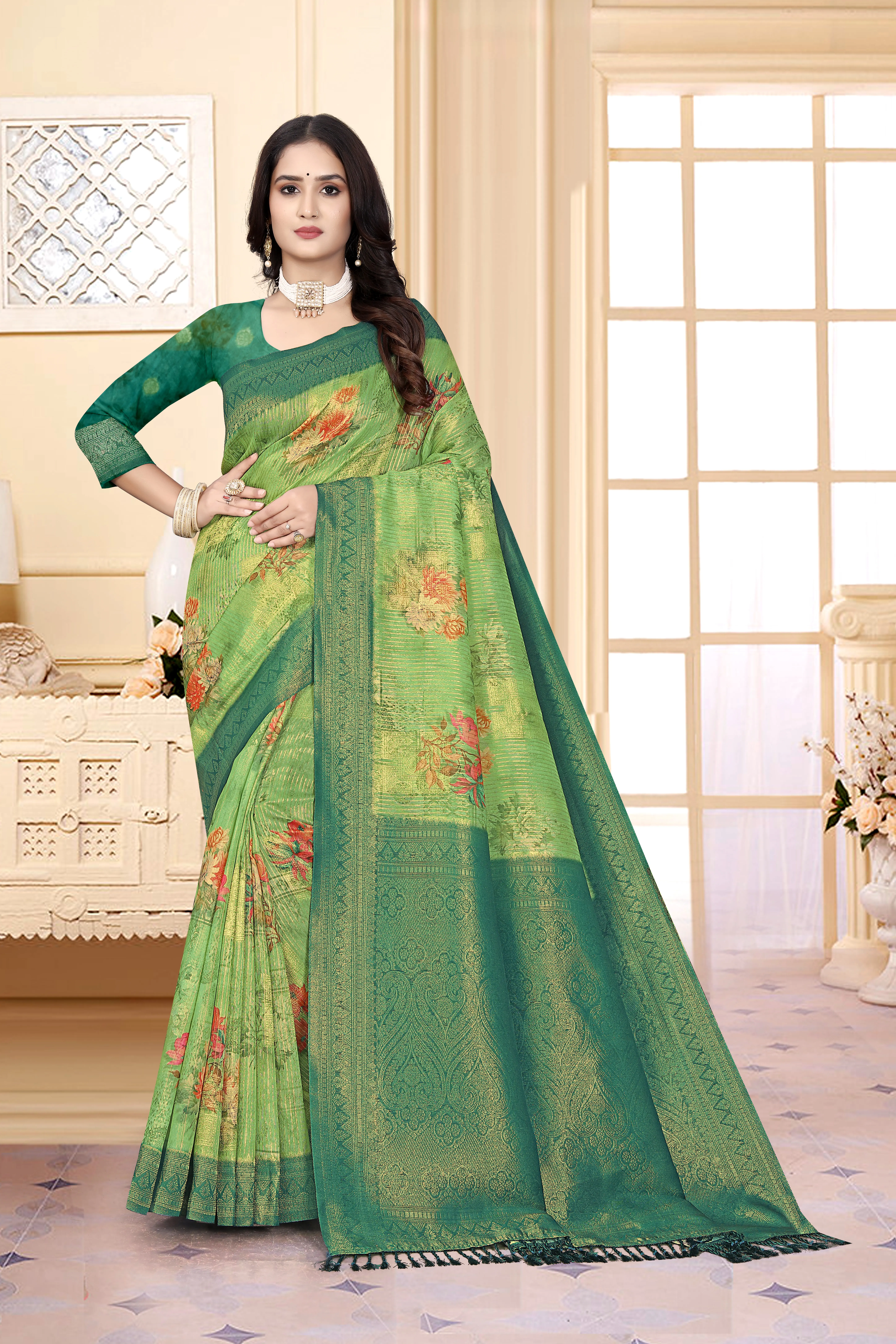 Embody the essence of purity and grace with the Tapo Bhoomi Saree, a symbol of timeless beauty and cultural heritage. Crafted from luxurious soft silk in a serene beige shade, this saree is adorned with vibrant floral motifs that reflect harmony, devotion, and artistry.